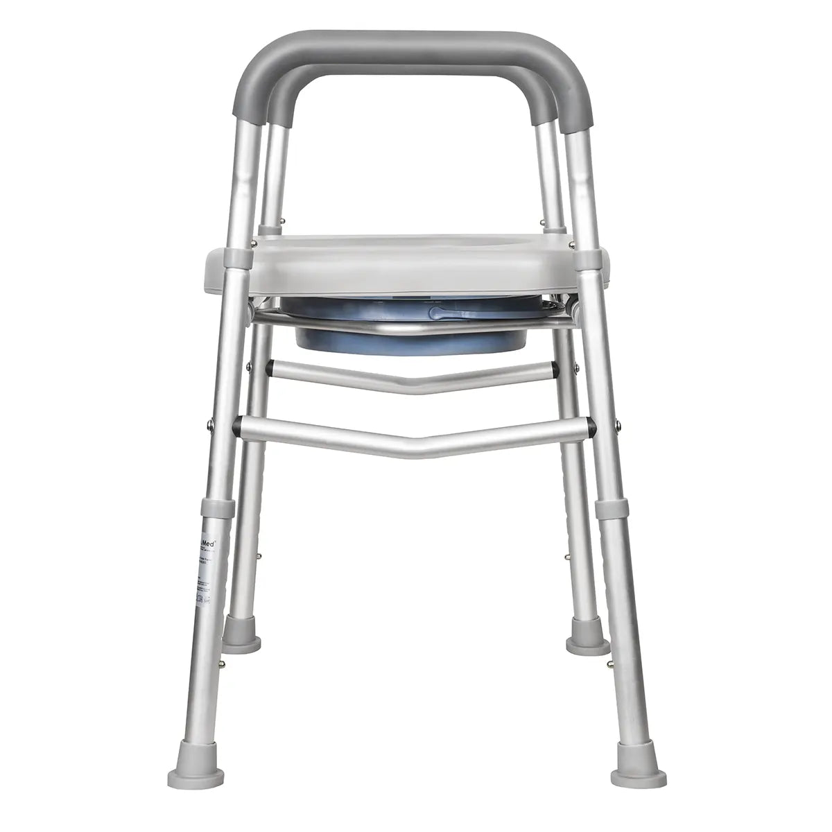 Over toilet frame with soft, padded seat, padded armrests, side stability cross-bracing and included optional pail.